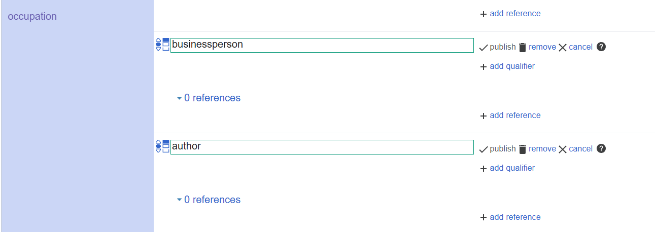 - Statements (déclarations) : ce sont des affirmations descriptives sur l'entité, comme la profession, la date de création, le pays, etc. Elles peuvent être sourcées et détaillées.